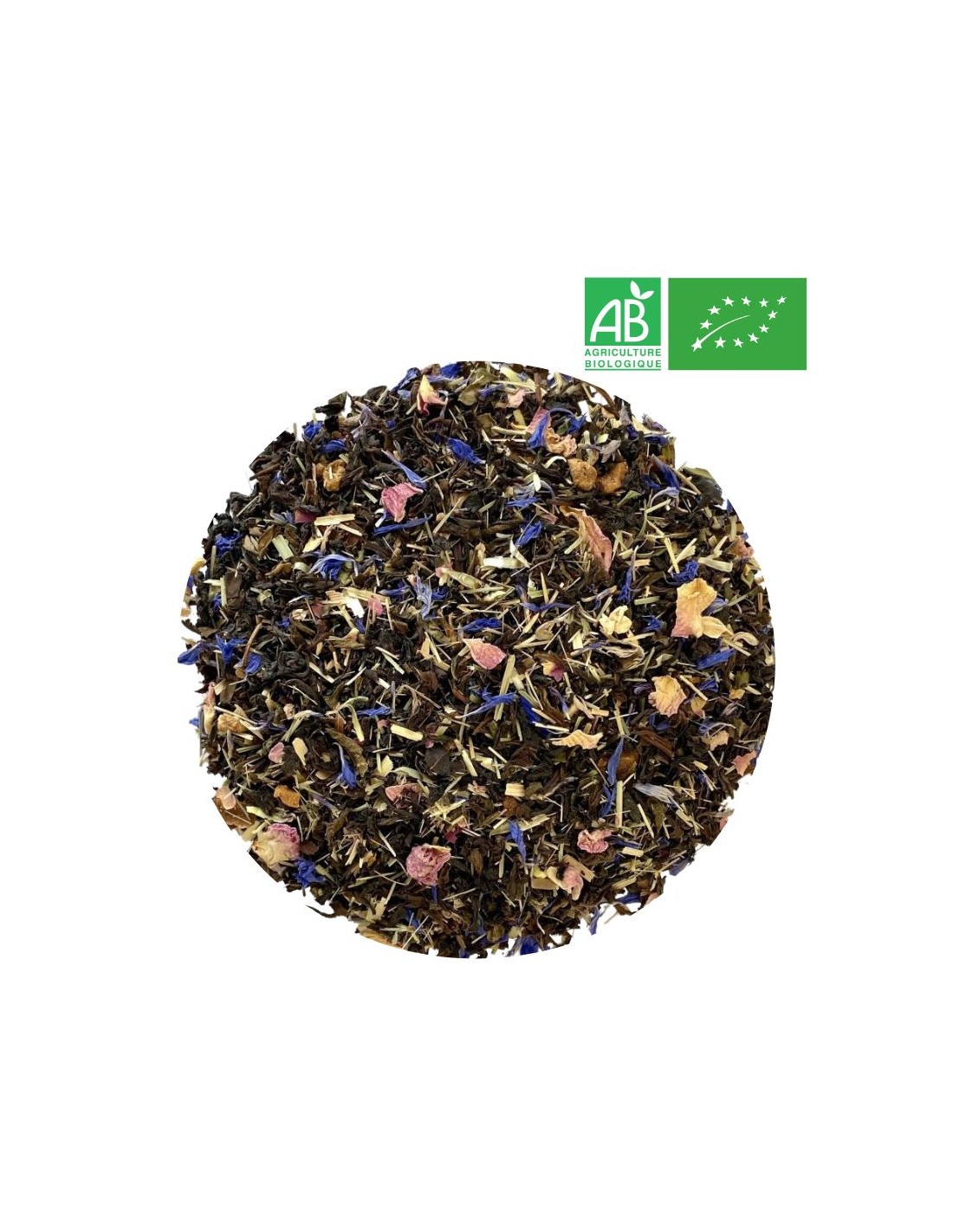 Ingrédients : thé noir, morceaux de mangue, morceaux d’ananas, citronnelle, pamplemousse , pomme , pétales de bleuet, pétale de rose, citron